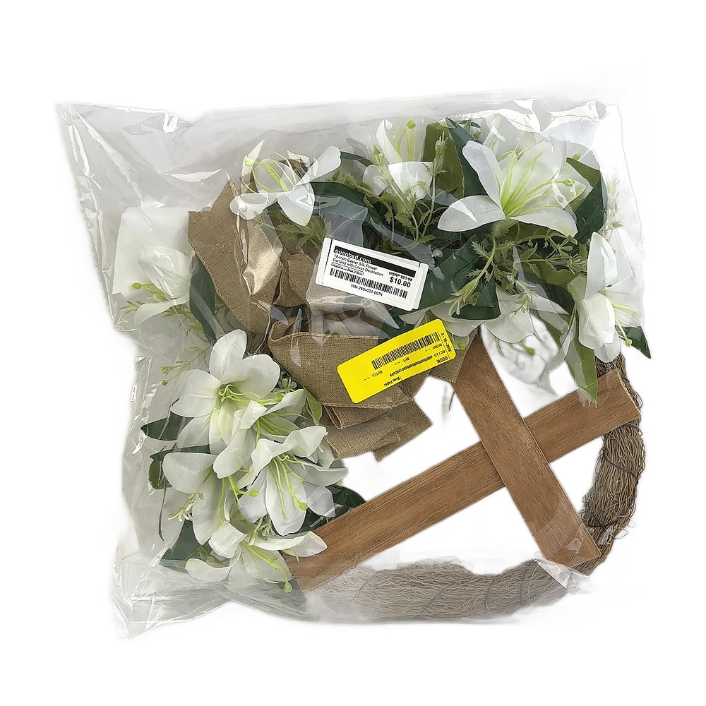This 18-inch Easter decoration features beautiful cream lilies, tulips, greenery, and a rustic burlap bow accented with a decorative cross and white veils. Made with silk flowers for lasting durability, it’s designed for front-door hanging or indoor display. Perfect for adding festive Easter charm to your home.