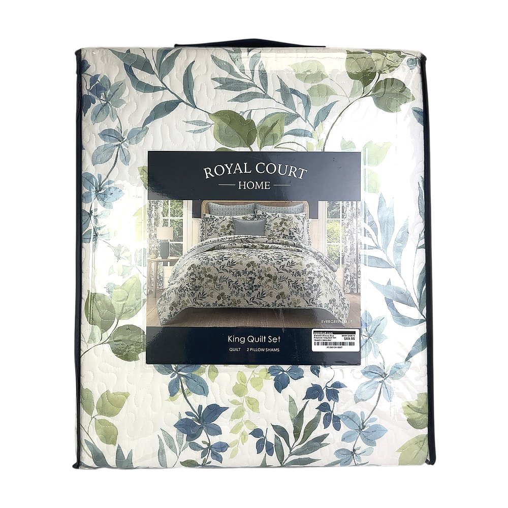 This three-piece quilt set includes one king quilt and two pillow shams, all crafted from durable polyester fabric in a rich blue color. The set provides complete bedroom coverage and a coordinated look for any master bedroom. Machine washable for easy care and maintenance.