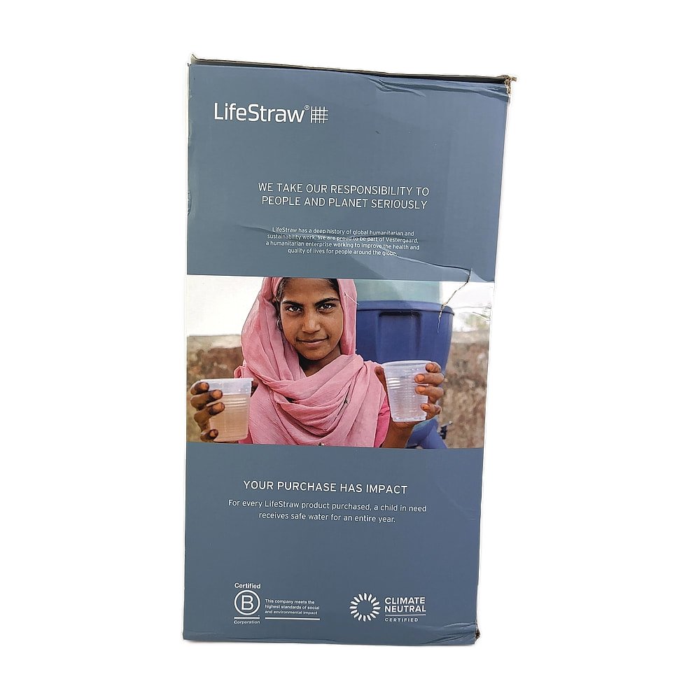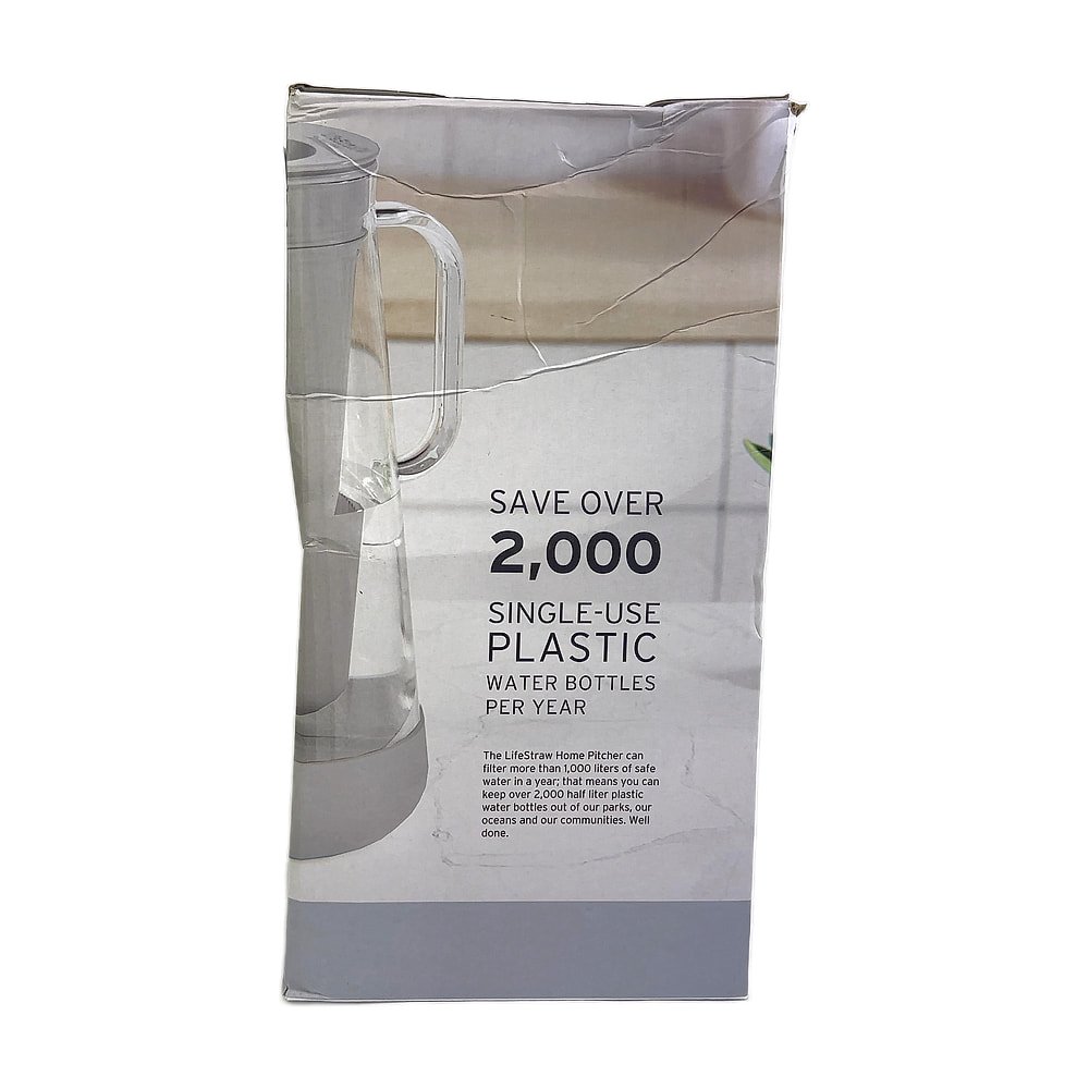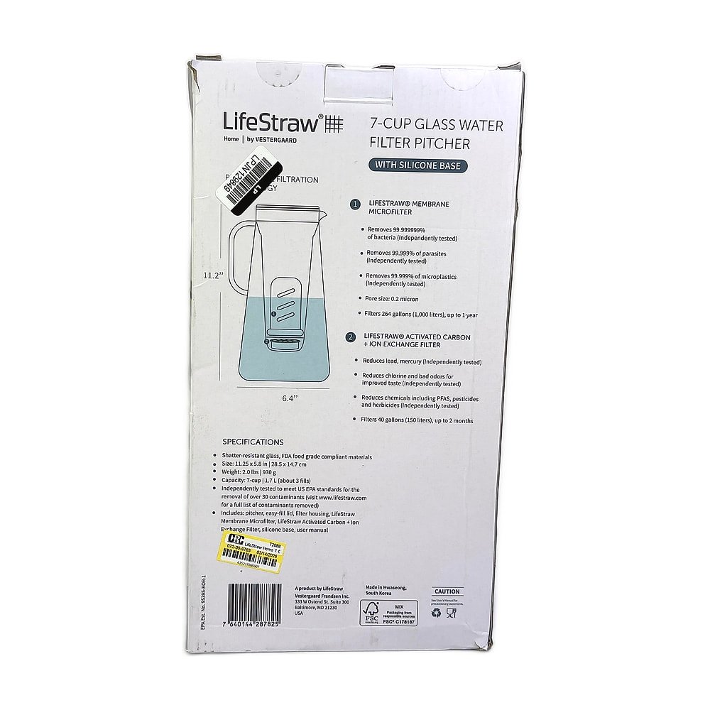 7-cup glass pitcher with LifeStraw filter technology and silicone base, removes contaminants from tap water.