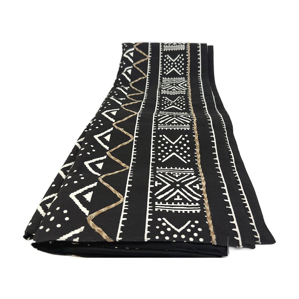 Decorative mud cloth table runner featuring traditional textile design.