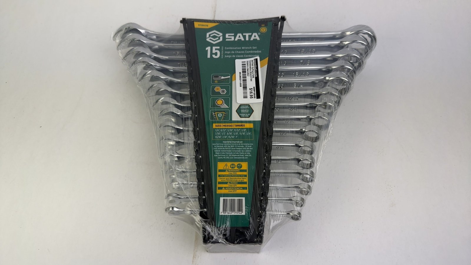 This 15-piece SAE combination wrench set from SATA includes both open-end and box-end wrenches for versatile fastening applications. The wrenches are precision-forged from high-quality steel for durability and reliability. Ideal for automotive work, equipment maintenance, and general mechanical tasks.