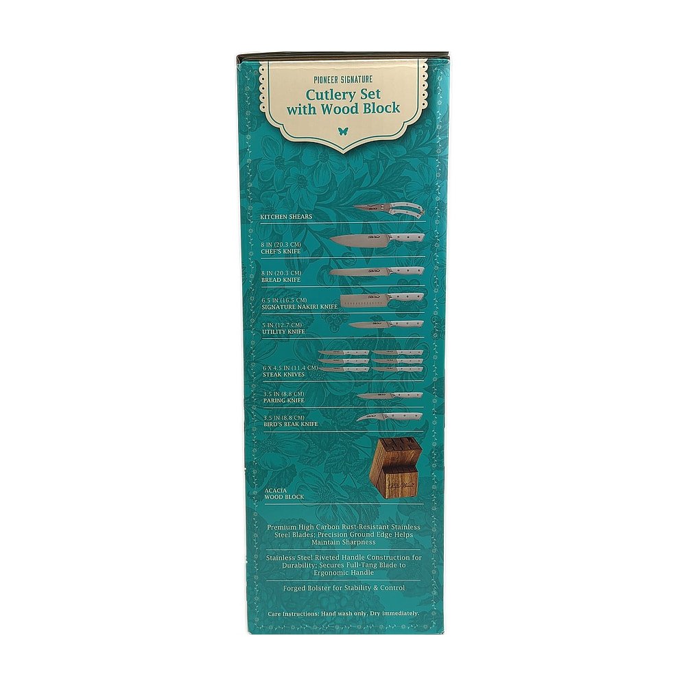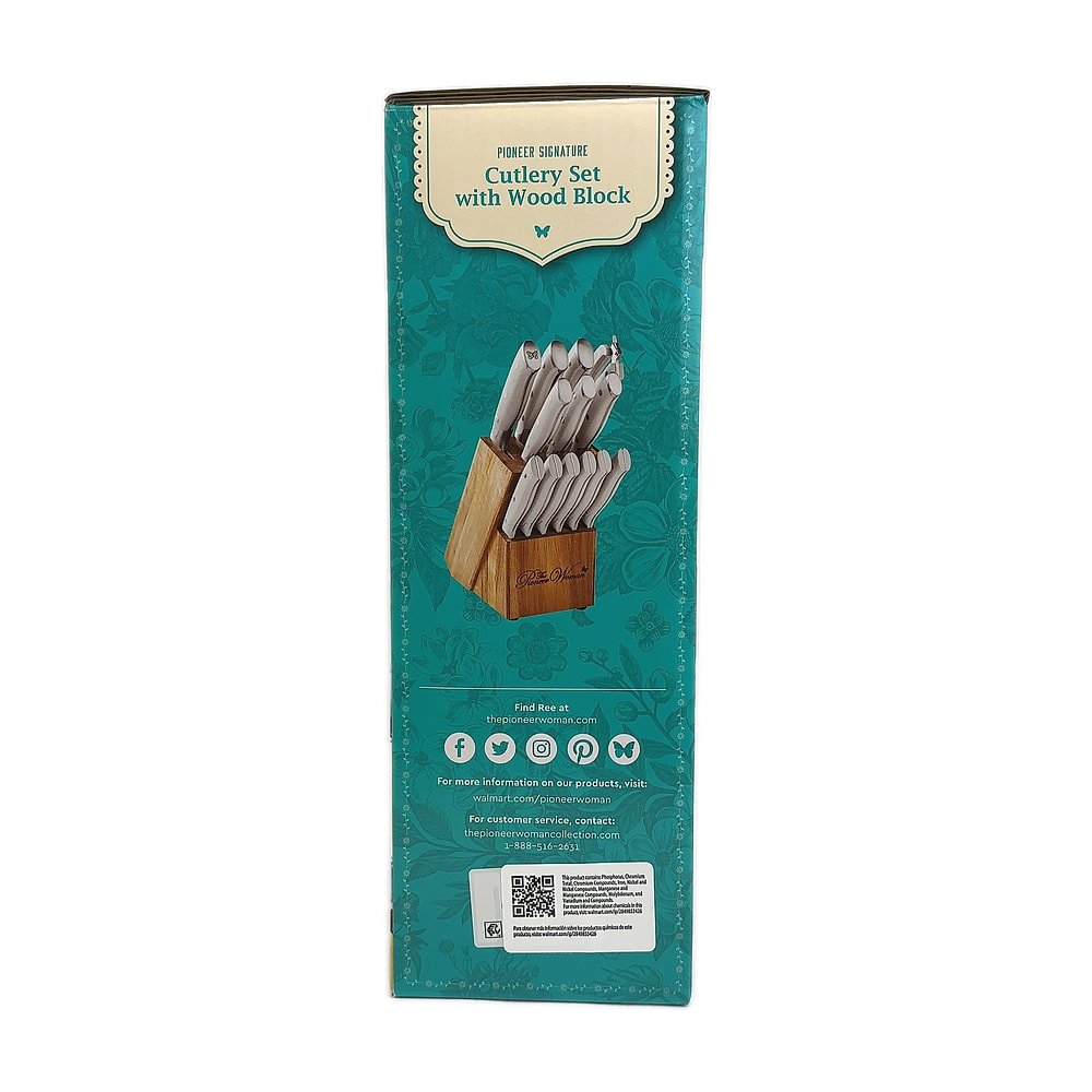 This 14-piece cutlery set includes essential knives and kitchen tools with The Pioneer Woman’s signature style. Perfect for everyday meal preparation and cooking tasks. The set provides excellent value for outfitting your kitchen with quality cutlery.